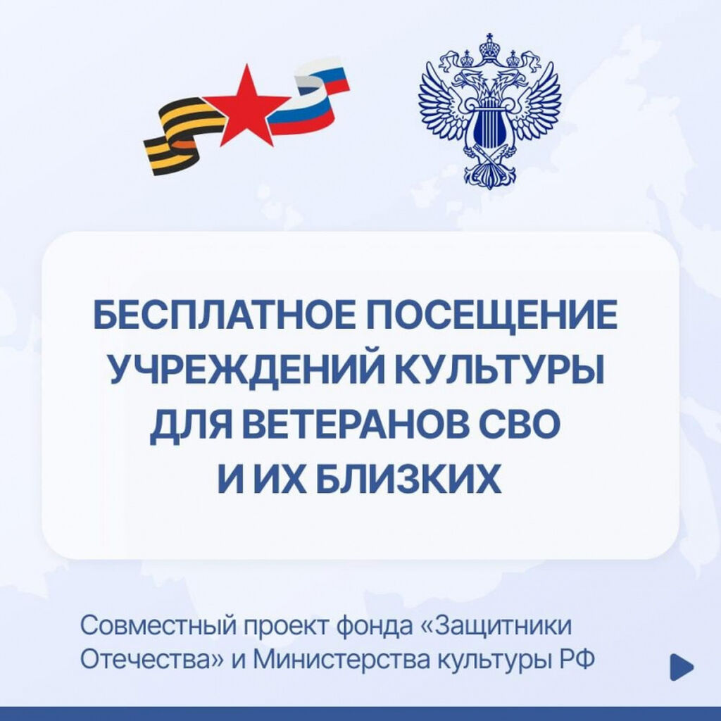 Министерство культуры Российской Федерации совместно с Государственным фондом поддержки участников специальной военной операции «Защитники Отечества» организовали проект, направленный на бесплатное посещение участниками специальной военной операции, ветеранами боевых действий из числа участников специальной военной операции и членами их семей мероприятий, реализуемых федеральными музеями и кинотеатрами, входящих в программу «Фонд Кинопроката».